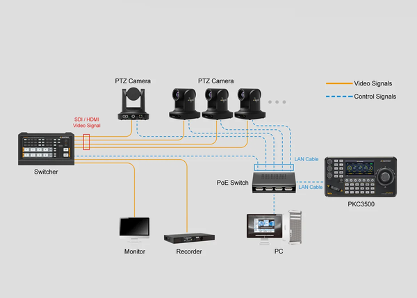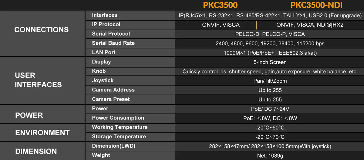 PKC3500 hỗ trợ điều khiển hỗn hợp (Cross-protocol mix-control) nhiều giao thức đồng thời như VISCA, IP VISCA, ONVIF, Pelco-P/D và NDI. Hệ thống cổng kết nối vật lý phong phú bao gồm RS-232, RS-422 và RS-485, đảm bảo tương thích với mọi loại camera từ truyền thống đến hiện đại.