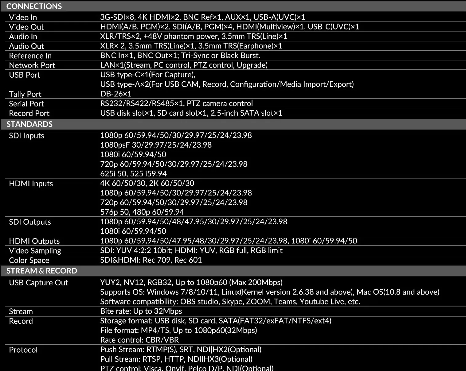 USB-C UVC Capture: Cổng USB Type-C hoạt động như một webcam, truyền video và âm thanh không nén (Uncompressed) tới các phần mềm như OBS, VMIX, ZOOM, Teams.