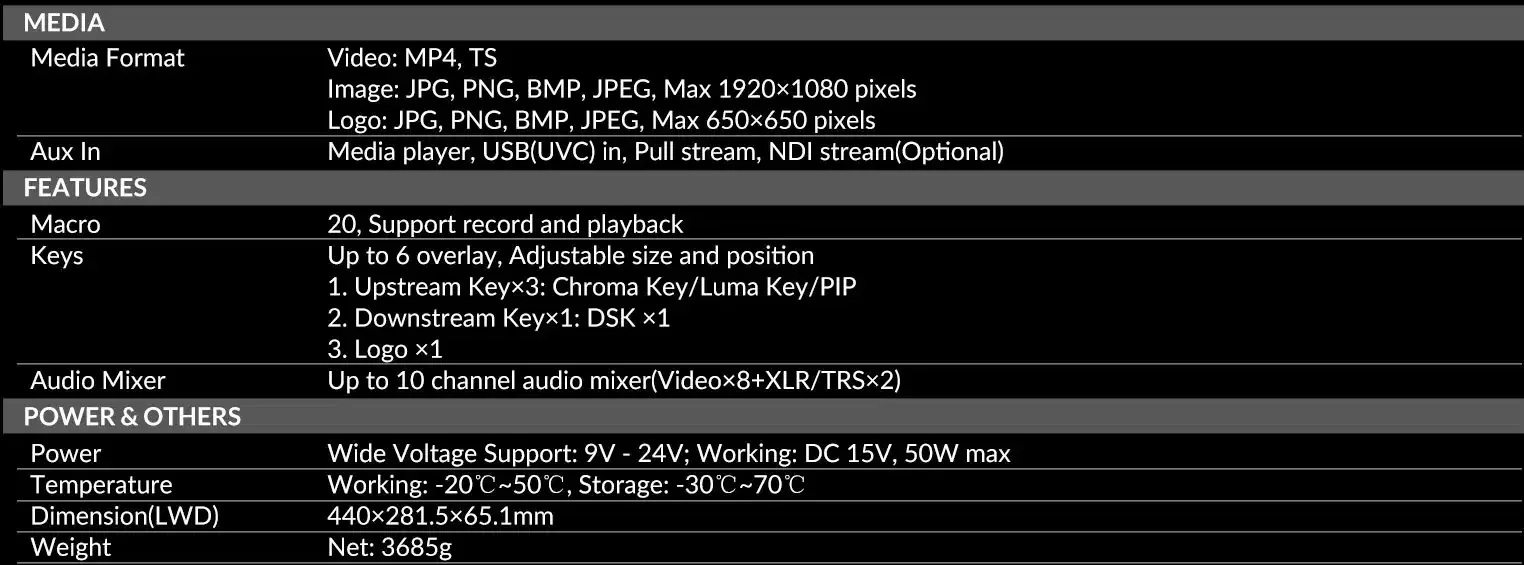 Keyer Chuyên Nghiệp: Tích hợp Chroma Key, Luma Key, DSK, Logo Overlay và 3x PIP (Picture-in-Picture) tùy chỉnh kích thước và vị trí dễ dàng, lý tưởng cho việc tạo ra studio ảo và nội dung sáng tạo.