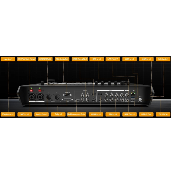 8 Kênh Đầu Vào: Gồm 6x 3G-SDI và 2x SDI/4K HDMI, cho phép bạn kết nối nhiều loại camera và nguồn phát khác nhau, hỗ trợ tín hiệu lên tới 4K60.