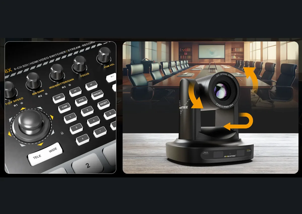 Điều Khiển PTZ Camera: Hỗ trợ điều khiển đồng thời tới 8 PTZ camera qua RS232/422/485 và LAN, tương thích các giao thức VISCA/ONVIF/NDI (tùy chọn), giúp bạn dễ dàng thay đổi góc quay mà không cần người vận hành riêng.