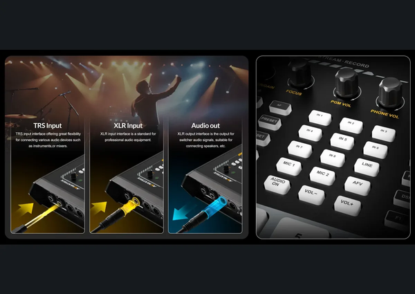 Âm Thanh XLR Chuyên Nghiệp: Đầu vào/ra XLR Balance hỗ trợ Nguồn Phantom 48V cho micro condenser, cùng tính năng trộn âm (Audio Mixing) và điều chỉnh độ trễ, đảm bảo chất lượng âm thanh đẳng cấp.