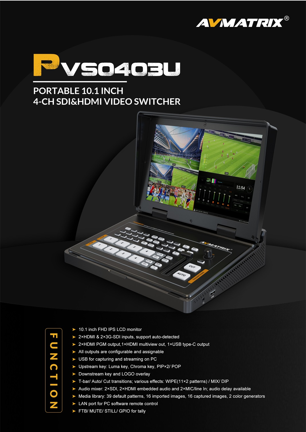 Bàn trộn video Avmatrix PVS0403U giá tốt tại Hà Nội là một người bạn đồng hành mật thiết của rất nhiều người làm việc trong lĩnh vực quay phim, livestream hiện nay. Thiết bị này đem đến tính linh hoạt trong việc chuyển đổi video và trộn âm thanh chuyên nghiệp. Được dùng nhiều phục vụ ghi hình trong các trận đấu bóng đá, trình diễn âm nhạc, các chương trình quay với nhiều góc khác nhau…