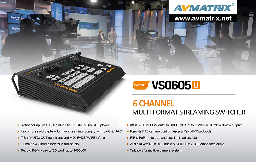 Avmatrix VS0605U là bộ trộn video đa định dạng với 6 kênh SDI / DVI-I / VGA / HDMI và điều khiển PTZ tích hợp. VS 0605U có khả năng trộn âm thanh với XLR, RCA và âm thanh tuỳ chọn.