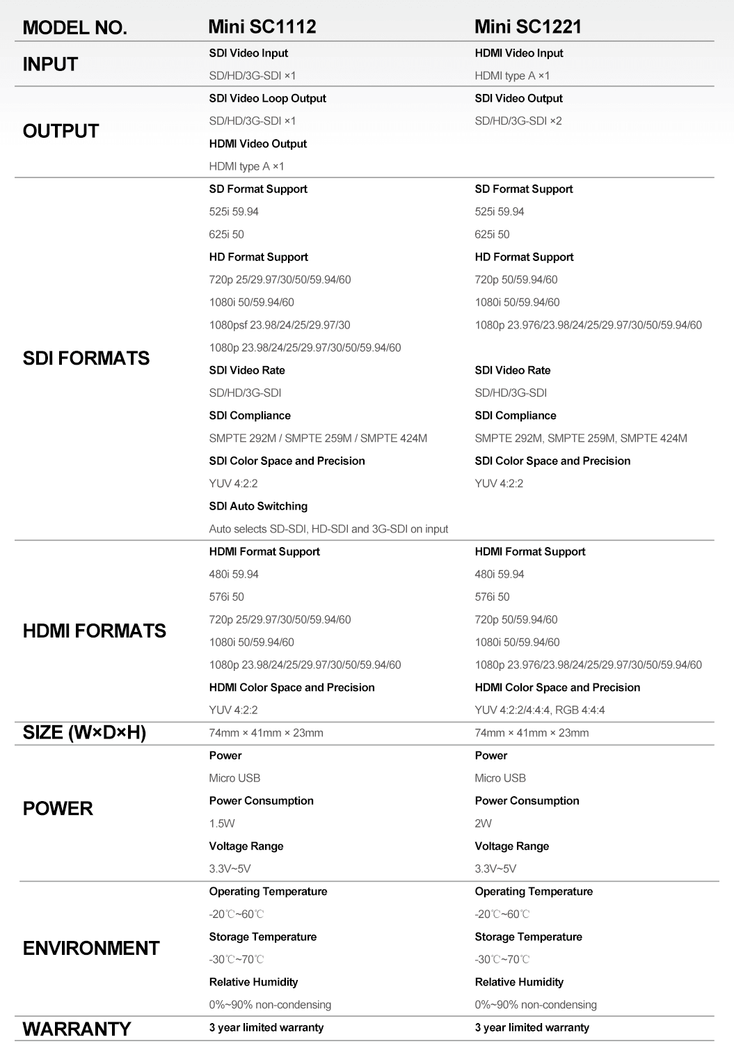 Mini SC1221 có đầu vào HDMI kích thước đầy đủ và hai đầu ra 3G-SDI và hỗ trợ độ phân giải lên đến 1080p60. Tuân theo EMC, Mini SC1221 có thể được sử dụng một cách đáng tin cậy 24 giờ một ngày, 7 ngày một tuần mà không bị gián đoạn, lag hoặc chậm trễ. Một giá đỡ cũng được bao gồm để dễ dàng gắn / tháo ra và cho phép gắn trong nhà hoặc ngoài trời một cách thuận tiện.