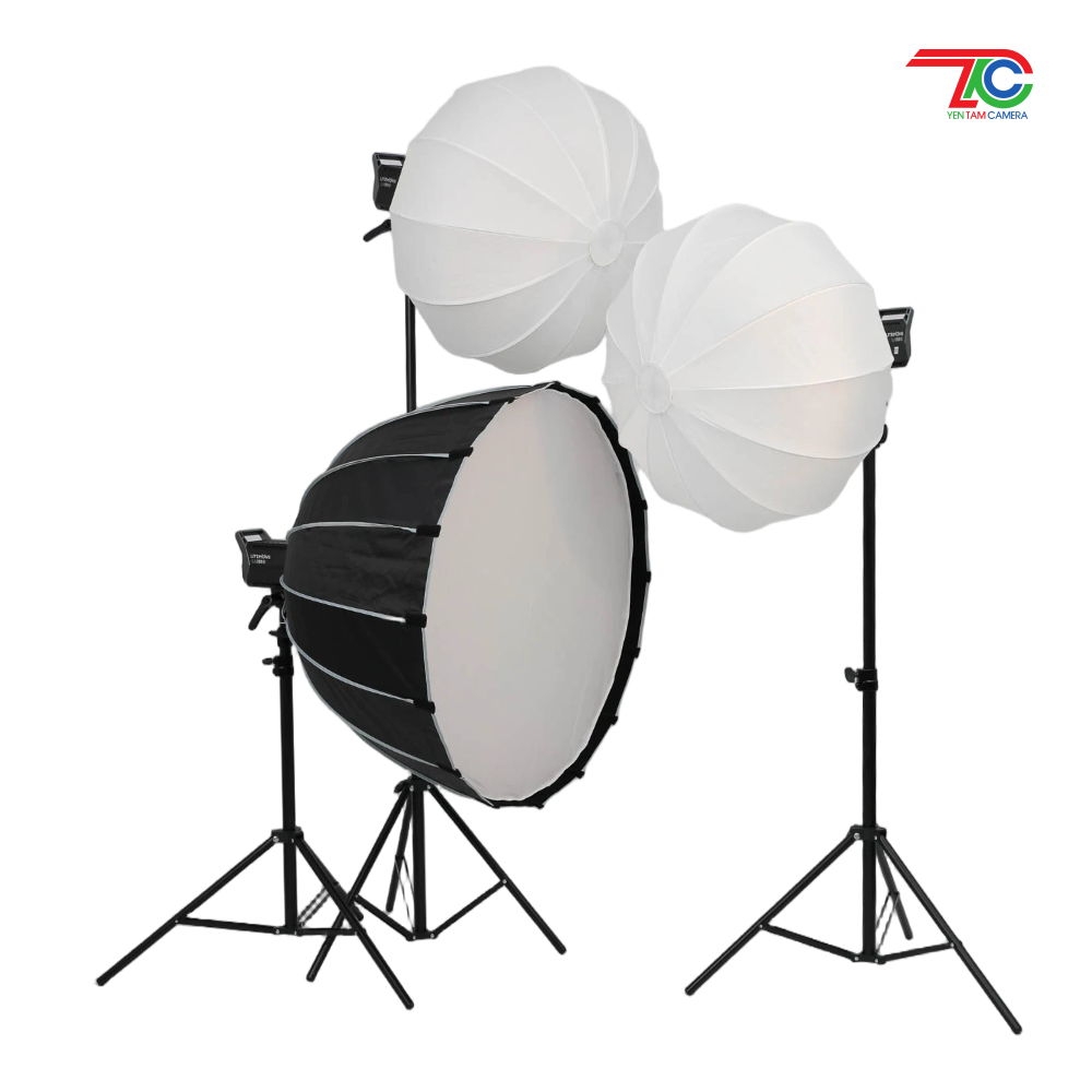 Softbox cầu 65cm: Với lớp phủ trắng bên trong, softbox này làm mềm ánh sáng từ đèn LED, loại bỏ những vùng sáng chói và tạo ra ánh sáng dịu nhẹ, tự nhiên hơn. Điều này giúp làm đẹp khuôn mặt người dẫn chương trình, làm nổi bật sản phẩm và tạo cảm giác thoải mái cho người xem.