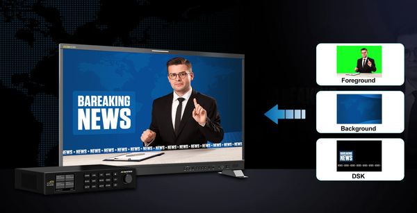 KM32-4K không chỉ tách nền. Nó còn hỗ trợ các chức năng nâng cao như DSK (Downstream Key) và Luma Key để bạn chèn logo, phụ đề hay các lớp đồ họa khác.