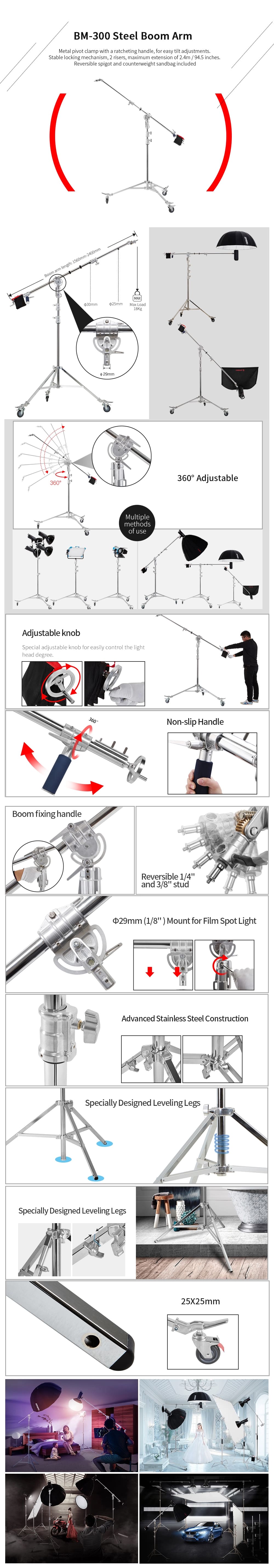 Jinbei BM300 Boom Stand là chân đèn bằng thép cực kỳ ổn định dành cho studio chụp ảnh và quay phim chuyên nghiệp . Chân máy studio làm bằng thép bền và có khả năng chịu tải đứng là 30kg, với bán kính hoạt động lớn, thích ứng linh hoạt với mọi yêu cầu trên phim trường. Nó thể hiện thế mạnh của mình đặc biệt trong nhiếp ảnh chân dung, làm đẹp, thời trang hoặc sản phẩm .