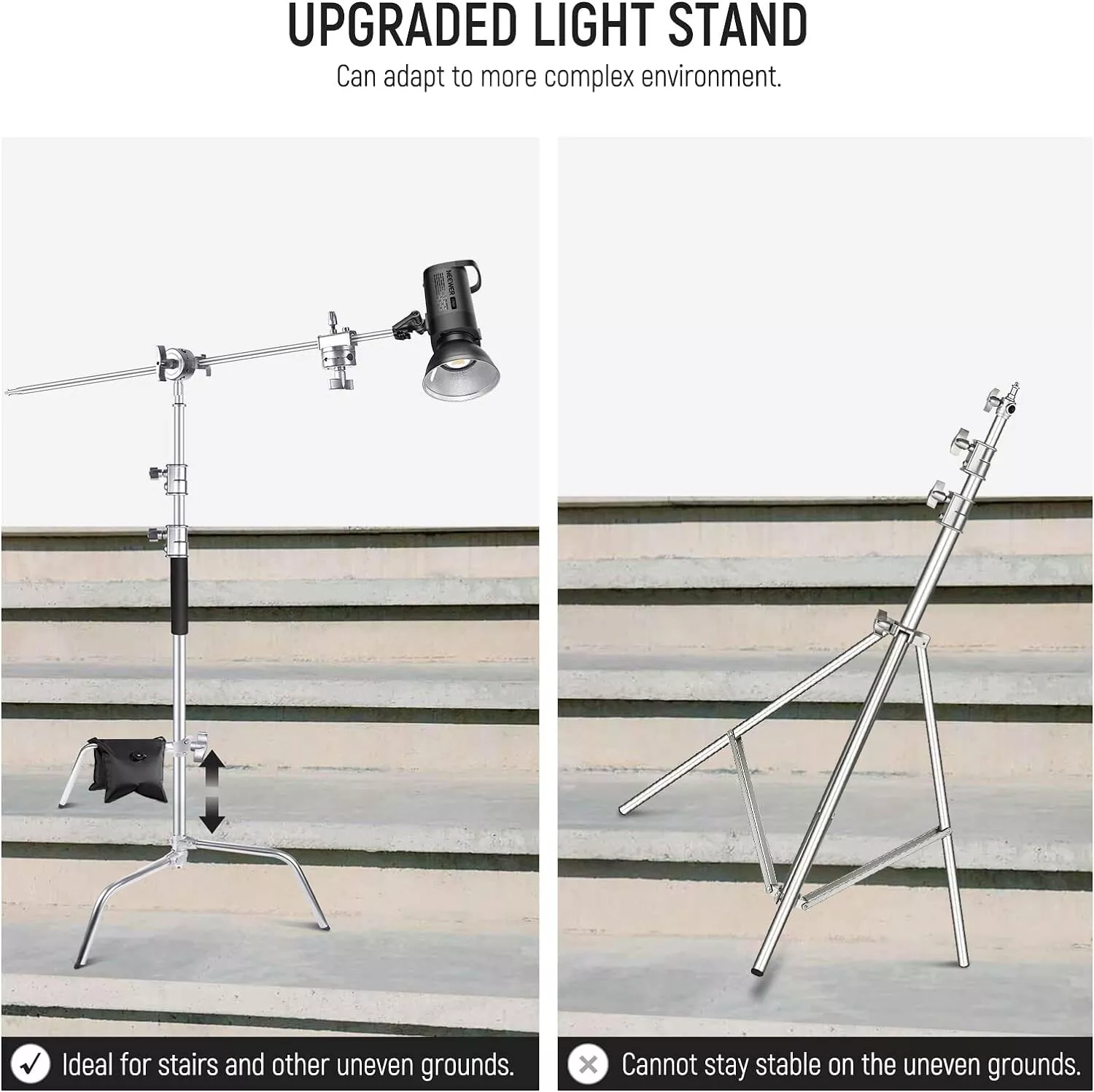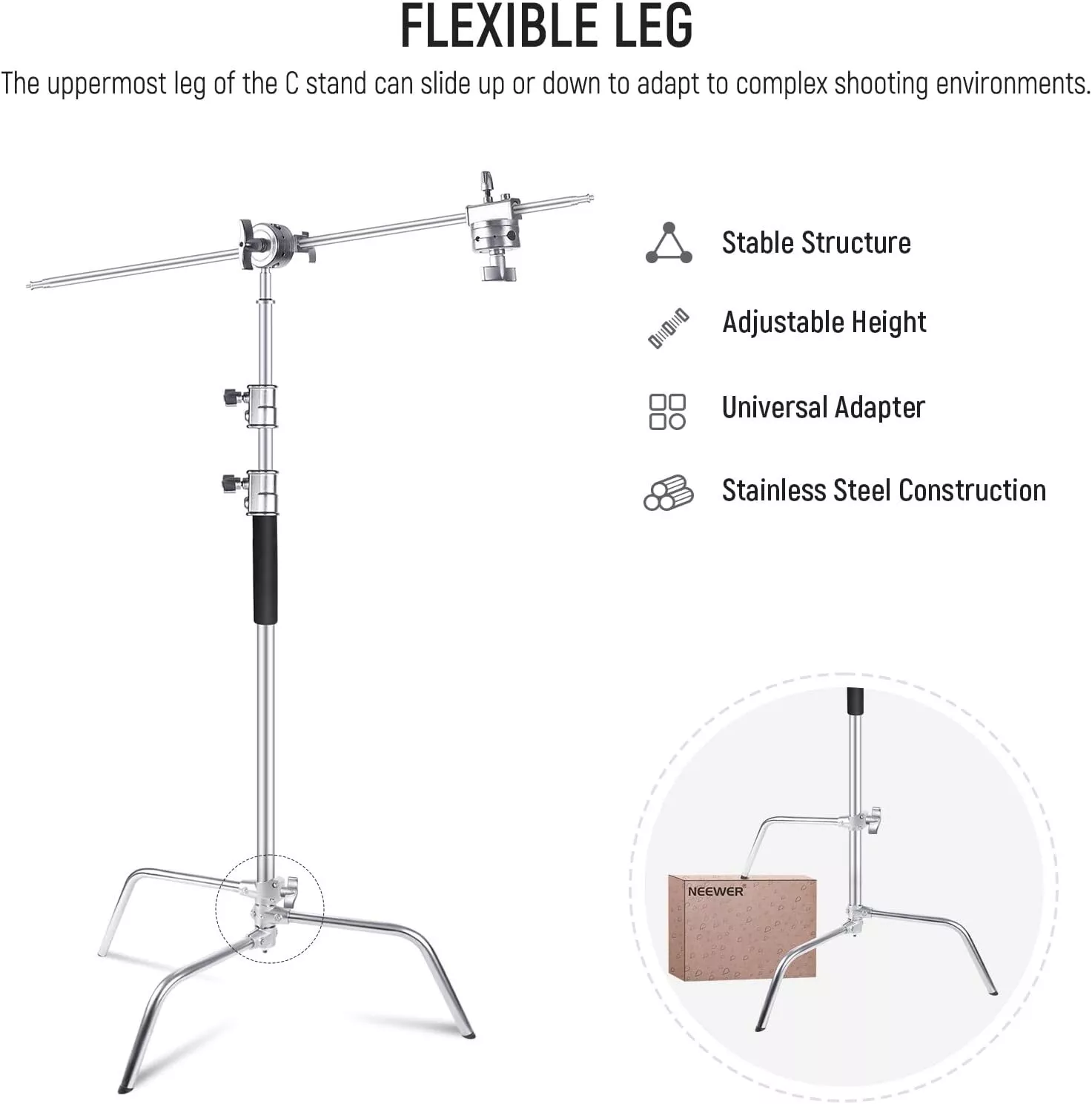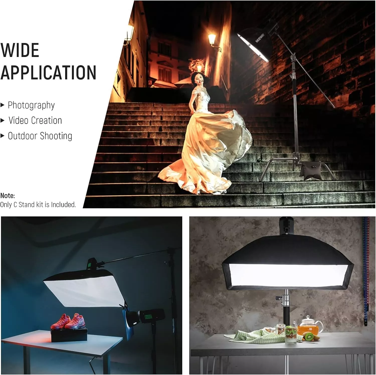 Được thiết kế vô cùng bắt mắt,gọn nhẹ, các chi tiết vô cùng sắc nét và kết nối với nhau một cách ăn khớp đến từng chi tiết nhỏ .Chân đèn C-Stand có khả năng chịu tải trọng lượng của đèn flash studio, flash speedlite ,...để chụp sản phẩm nhỏ hoặc kết hợp với các phụ kiện khác trong thiết bị phòng chụp khác một cách tối đa.