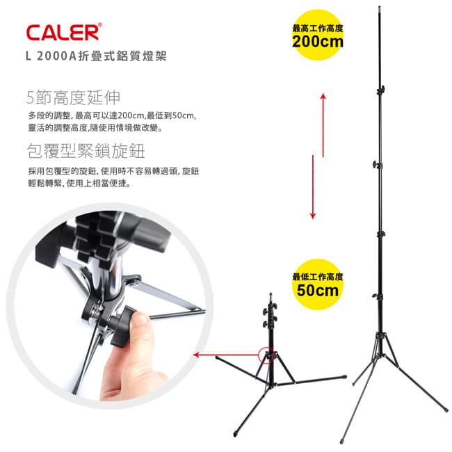 Chân đèn Jinbei L2000A được chia thành năm phần điều chỉnh độ cao, thiết kế gấp đặc biệt cho phép các nhiếp ảnh gia làm việc để tiện lắp ráp có thể được hoàn hảo hơn kết thúc một cách nhanh chóng, các núm xoay để điều chỉnh một cách nhanh chóng và dễ dàng tại thời điểm chụp, được cố định và ổn định để đáp ứng nhu cầu chụp ở các độ cao khác nhau.