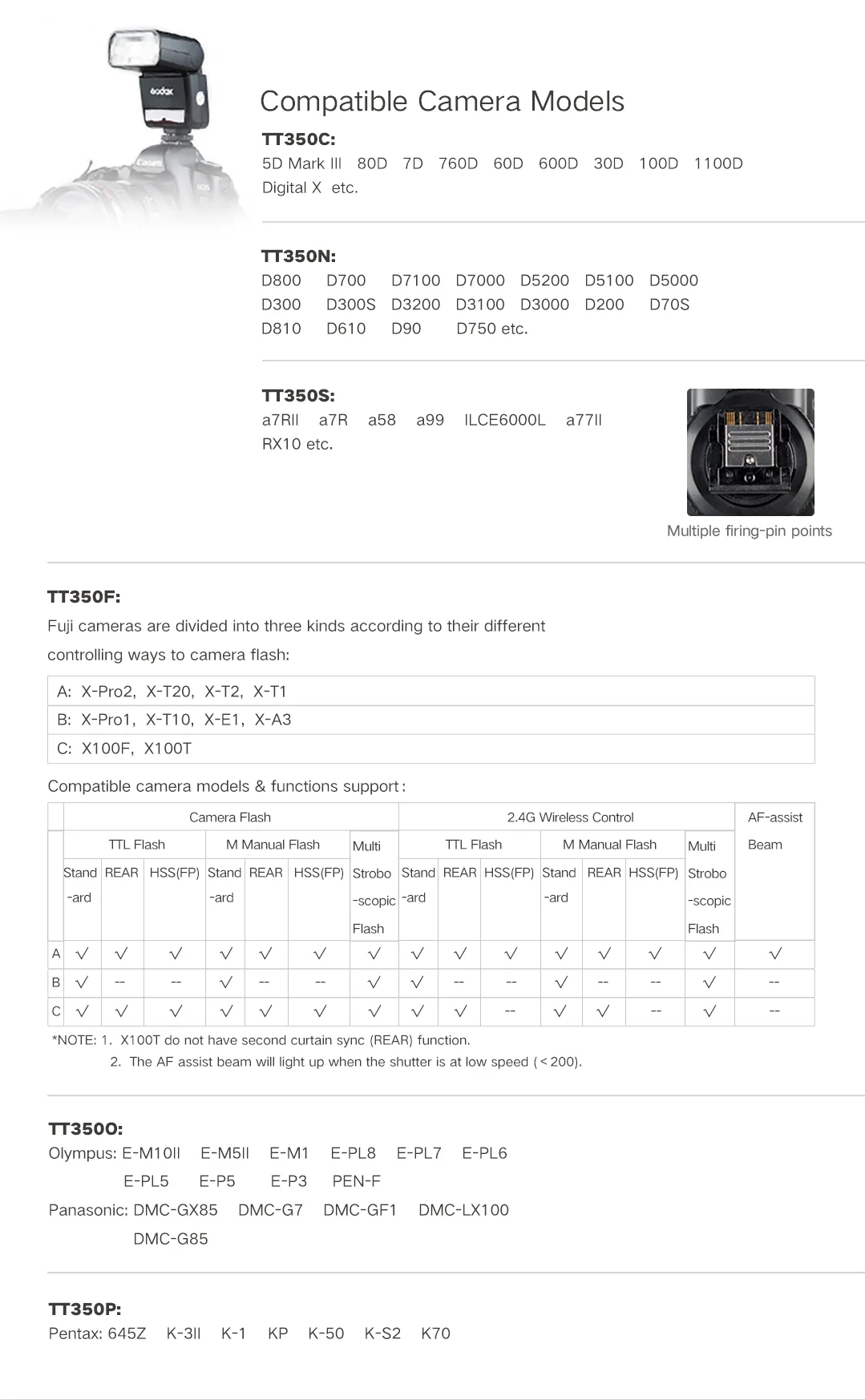 Quên đi nỗi lo về khả năng tương thích. TT350 có phiên bản riêng biệt cho Canon E-TTL II, Nikon i-TTL, Sony, Fujifilm, Olympus và Pentax, đảm bảo đo sáng TTL tự động chính xác nhất.