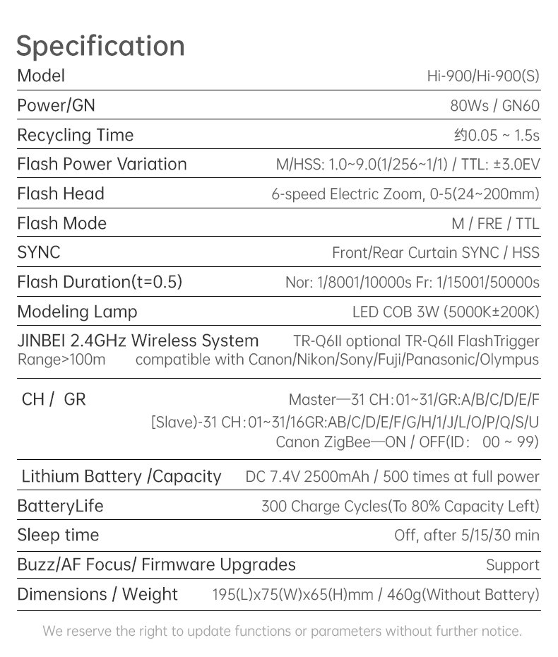 JINBEI HI-900 đi kèm với một số cải tiến. Nó bao gồm một đèn hoa tiêu phía trước để dễ dàng xem trước và thích ứng với ánh sáng xung quanh, với độ sáng có thể điều chỉnh trong 10 cấp độ. Một nút nhanh mới ở bên cạnh cho phép chuyển nhanh giữa chế độ thủ công và chế độ TTL. Ngoài ra, khóa nhả nhanh đã được thay thế bằng cần gạt nhanh để gắn chắc chắn đèn flash vào hot shoe của máy ảnh.