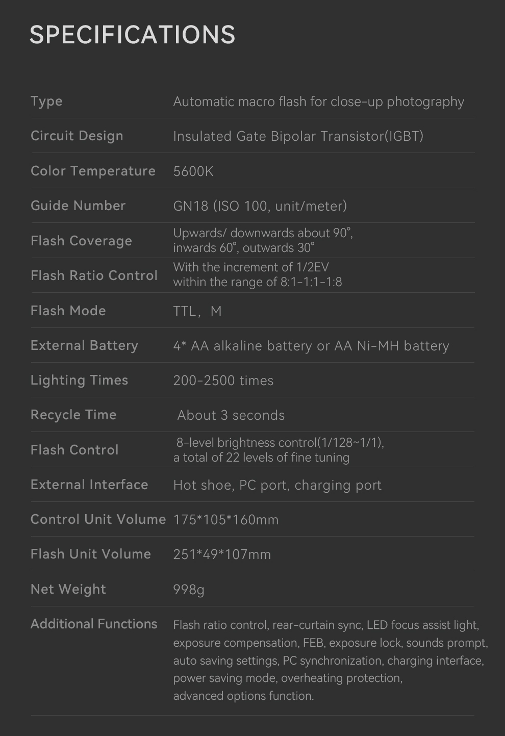 | Kiểm soát flasg | 8 cấp độ (1/128-1/1), 22 cấp độ tính chỉnh |
