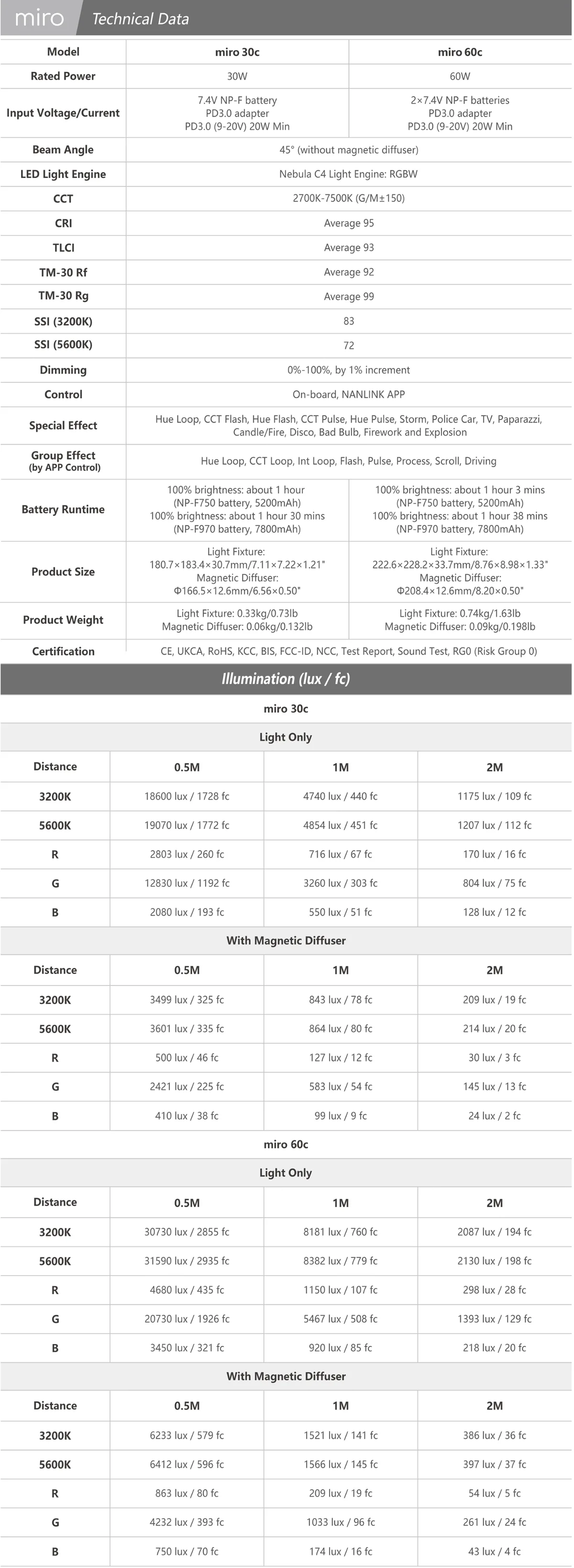 Công Suất 60W Khủng, Kích Thước Siêu Gọn: Miro 60C đạt độ sáng vượt trội 8.382 lux @1m (5600K). Kích thước chỉ bằng một đĩa salad (8.2 inch) và nặng 0.74 kg, lý tưởng để tạo ra ánh sáng chuyên nghiệp mà không cần thiết bị cồng kềnh.