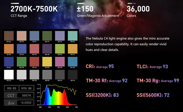 Chất Lượng Màu Sắc Chuẩn Điện Ảnh: Với CRI 95 và TLCI 93, đèn đảm bảo màu sắc luôn chính xác và trung thực trên cảm biến máy ảnh. Pin màu (colorimetry) tuyệt vời này giúp giảm thiểu thời gian chỉnh màu hậu kỳ.