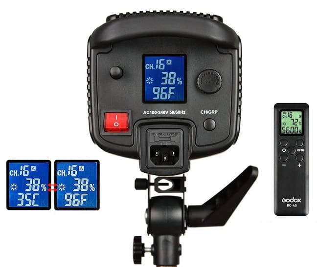 Đèn Studio Godox SL 200W thiết kế màn hình LCD phía sau, và mặt số với điều chỉnh mờ 10 – 100% bằng nút Dimmer. Bạn cũng có thể điều chỉnh màn hình LED bằng remote không dây RC-A5 gồm 6 nhóm và 16 nhóm hệ thống, tần số không dây 433Mhz. Các thiết lập thông số điều tự động lưu, màn hình LED lớn, rõ ràng dễ dàng giúp bạn kiểm soát các thông số về độ sáng, kênh (nhóm), nhiệt độ hoạt động, có thể điều chỉnh độ sáng cho nhiều đèn Led cùng lúc.