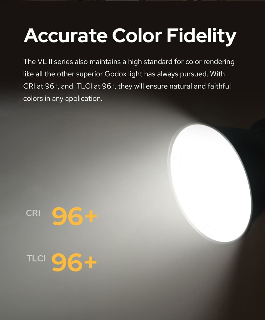 Dòng VL II cũng duy trì tiêu chuẩn cao về khả năng hiển thị màu sắc giống như tất cả các dòng đèn Godox cao cấp khác luôn theo đuổi. Với CRI ở mức 96+ và TLCI ở mức 96+, chúng sẽ đảm bảo màu sắc tự nhiên và trung thực trong mọi ứng dụng.