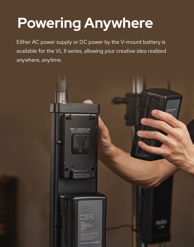 Nguồn điện AC hoặc nguồn DC bằng pin V-mount có sẵn cho dòng VL II, cho phép ý tưởng sáng tạo của bạn được hiện thực hóa ở mọi nơi, mọi lúc.