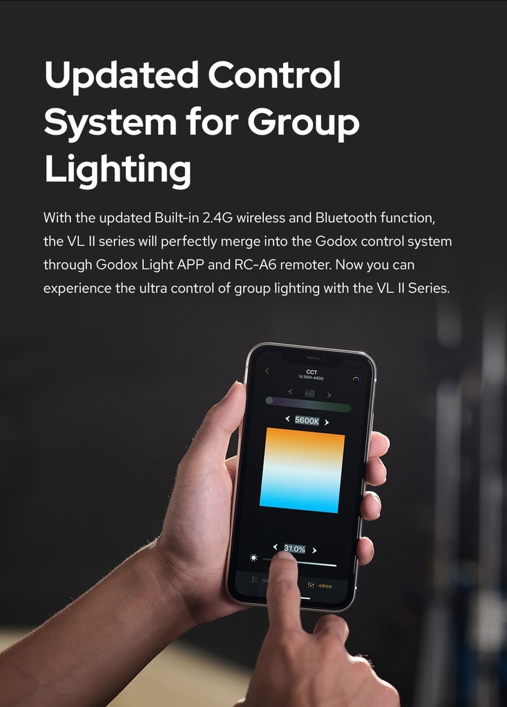 Với chức năng Bluetooth và không dây 2.4G tích hợp được cập nhật, dòng VL II sẽ kết hợp hoàn hảo với hệ thống điều khiển Godox thông qua Godox Light APP và bộ điều khiển từ xa RC-A6. Giờ đây, bạn có thể trải nghiệm khả năng kiểm soát ánh sáng nhóm cực cao với Sê-ri VL II.