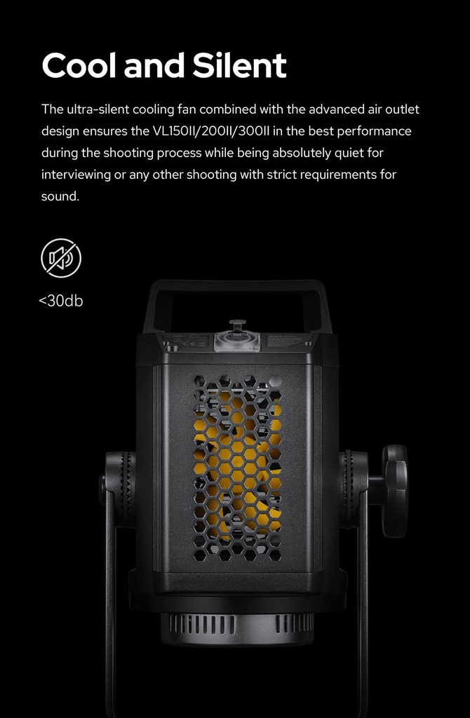 Quạt làm mát siêu êm kết hợp với thiết kế thoát khí tiên tiến đảm bảo VL150II/200II/300II hoạt động tốt nhất trong quá trình quay phim đồng thời hoàn toàn yên tĩnh khi phỏng vấn hoặc bất kỳ cảnh quay nào khác có yêu cầu nghiêm ngặt về âm thanh.