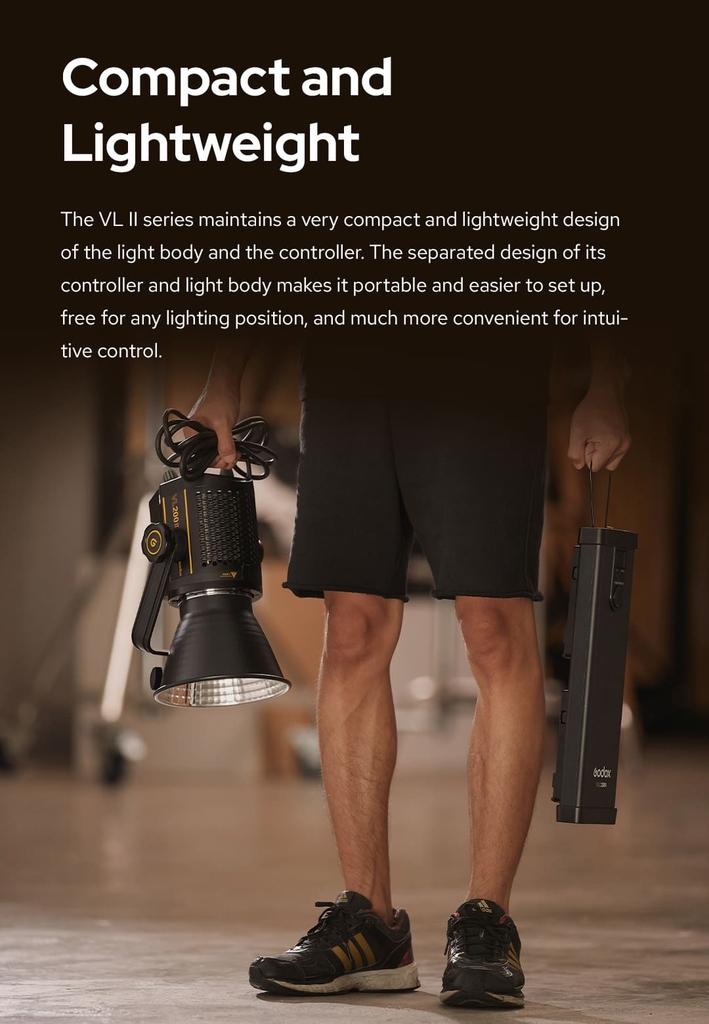 Dòng VL II duy trì thiết kế rất nhỏ gọn và nhẹ của thân đèn và bộ điều khiển. Thiết kế tách biệt của bộ điều khiển và thân đèn giúp thiết bị có tính di động và dễ lắp đặt hơn, tự do cho mọi vị trí chiếu sáng và thuận tiện hơn nhiều cho việc điều khiển trực quan.