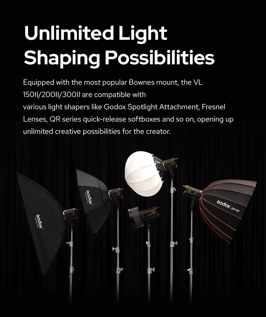 Được trang bị ngàm Bownes phổ biến nhất, VL 150II/200II/ 300II tương thích với nhiều thiết bị định hình ánh sáng khác nhau như Godox Spotlight Attachment, Ống kính Fresnel, hộp mềm nhả nhanh dòng QR, v.v., mở ra khả năng sáng tạo không giới hạn cho người sáng tạo.