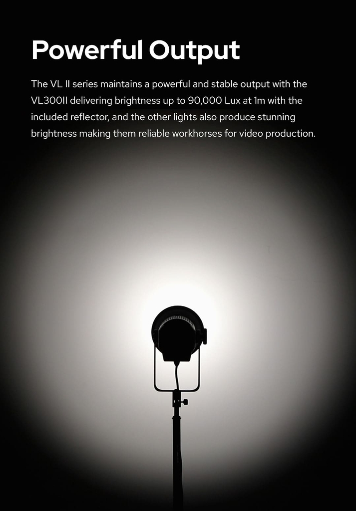 Sê-ri VL II duy trì công suất mạnh mẽ và ổn định với VL200II cung cấp độ sáng lên tới 90.000 Lux ở 1m với gương phản xạ đi kèm và các đèn khác cũng tạo ra độ sáng tuyệt đẹp khiến chúng trở thành những lựa chọn đáng tin cậy để sản xuất video.