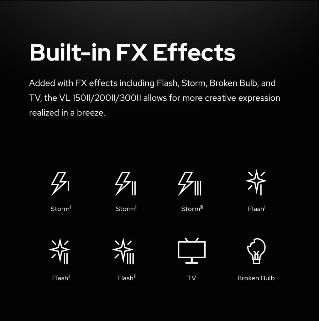 Được bổ sung các hiệu ứng FX bao gồm Flash, Storm, Bóng đèn hỏng và TV, VL 150||/200||/300|| cho phép thể hiện sáng tạo hơn một cách dễ dàng.