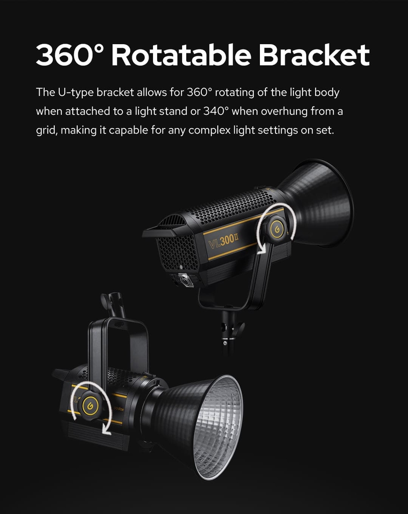 Giá đỡ kiểu chữ U cho phép thân đèn xoay 360° khi gắn vào chân đèn hoặc 340° khi treo ra khỏi lưới, giúp nó có khả năng thực hiện mọi cài đặt ánh sáng phức tạp trên phim trường.