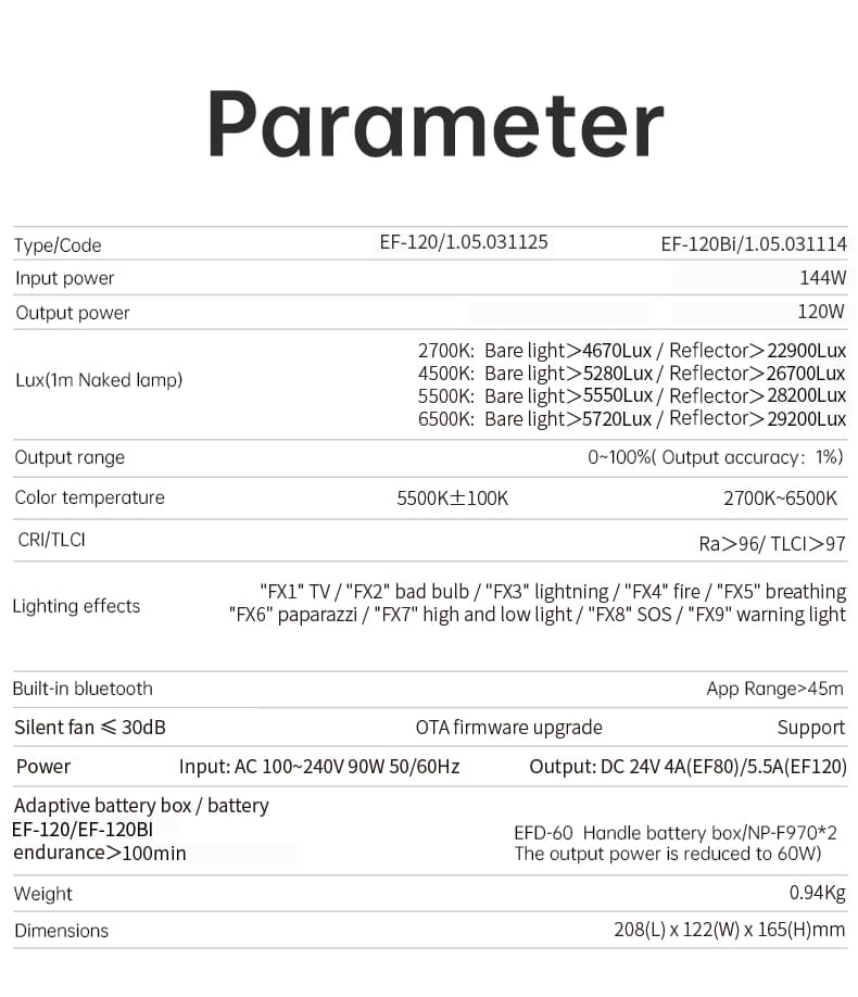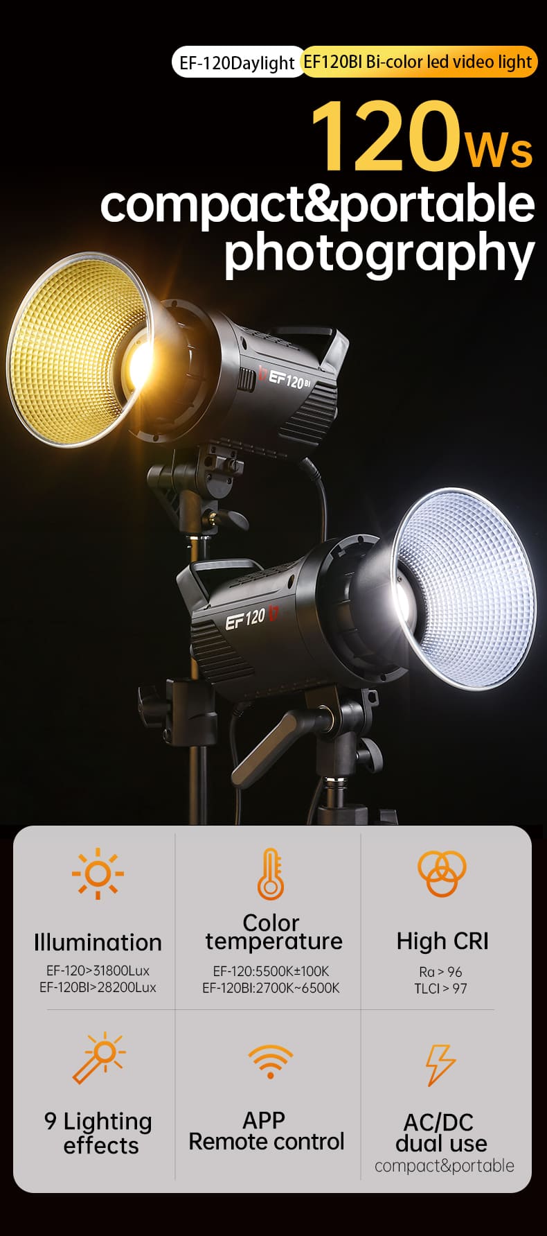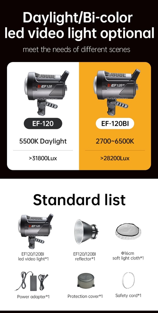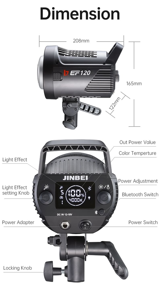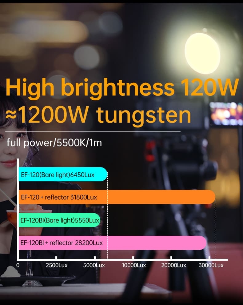 Đèn led studio Jinbei EF-120Bi đa năng nhỏ gọn dành cho việc quay phim và chụp hình. Sản phẩm này có công suất cao lên đến 120w và nhiệt độ màu dao động từ 2700K đến 6500K. Với kích thước nhỏ gọn chỉ 208x122x165 đèn dễ dàng mang theo khi di chuyển, rất phù hợp cho các nhiếp ảnh gia hay các dự án ngoài trời cần nguồn sáng đáng tin cậy.