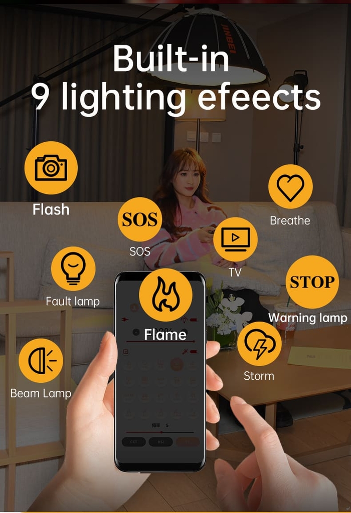 Hiệu ứng ánh sáng | Tiếng Anh: TV/Badbulb/Lightning/Fire/Breathing/Paparazzi/High&Low light/SOS/WarningLight Tiếng Việt: TV/Bóng đèn hỏng/Tia chớp/Lửa/Tay săn ảnh/Nhịp thở/Ánh sáng mạnh và yếu/SOS/Đèn cảnh báo |