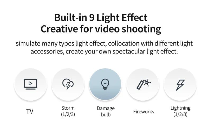 | Hiệu ứng ánh sáng | Tiếng Anh: Constant brightness/TV/Fault buld/Fireword/Storm1-3/Flash1-3/ Tiếng Việt: Độ sáng không đổi/TV/Bóng đèn lỗi/Pháo hoa/Bão 1-3/Flash 1-3/ |
