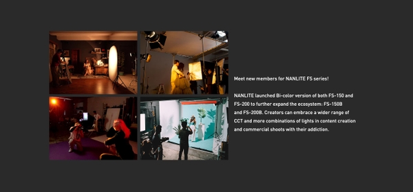 NANLITE ra mắt phiên bản Bi-color của cả FS-150 và FS-200 nhằm mở rộng hơn nữa hệ sinh thái. FS-150B và FS-200B. Người sáng tạo có thể sử dụng phạm vi CCT rộng hơn và nhiều sự kết hợp ánh sáng hơn. Sử dụng trong quá trình sáng tạo nội dung và quay quảng cáo với chứng nghiện của họ.