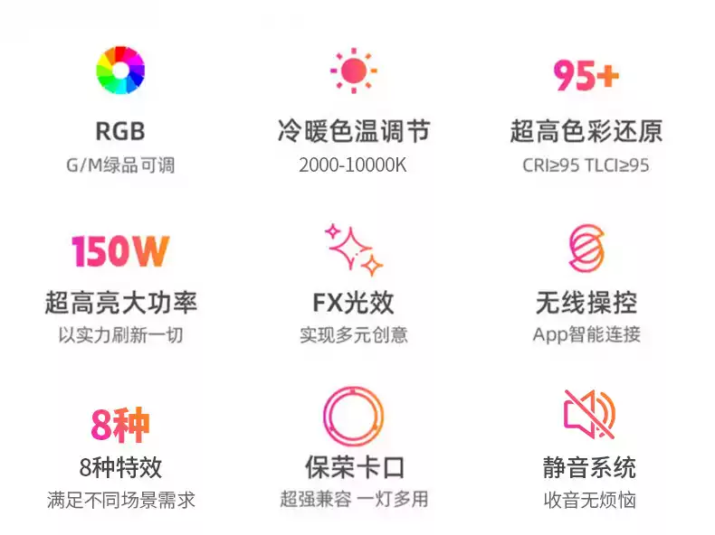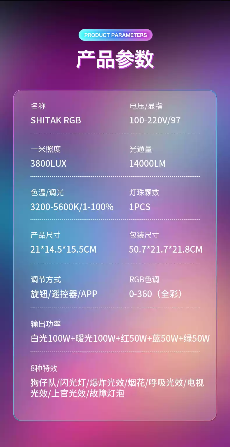 16. Công suất đầu ra: trắng 100W+ấm 100W+Đỏ 50w+Xanh lam 50w+Xanh lục 50W