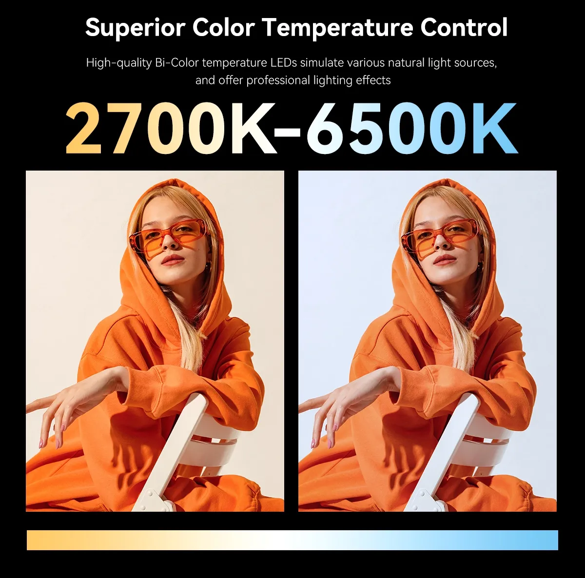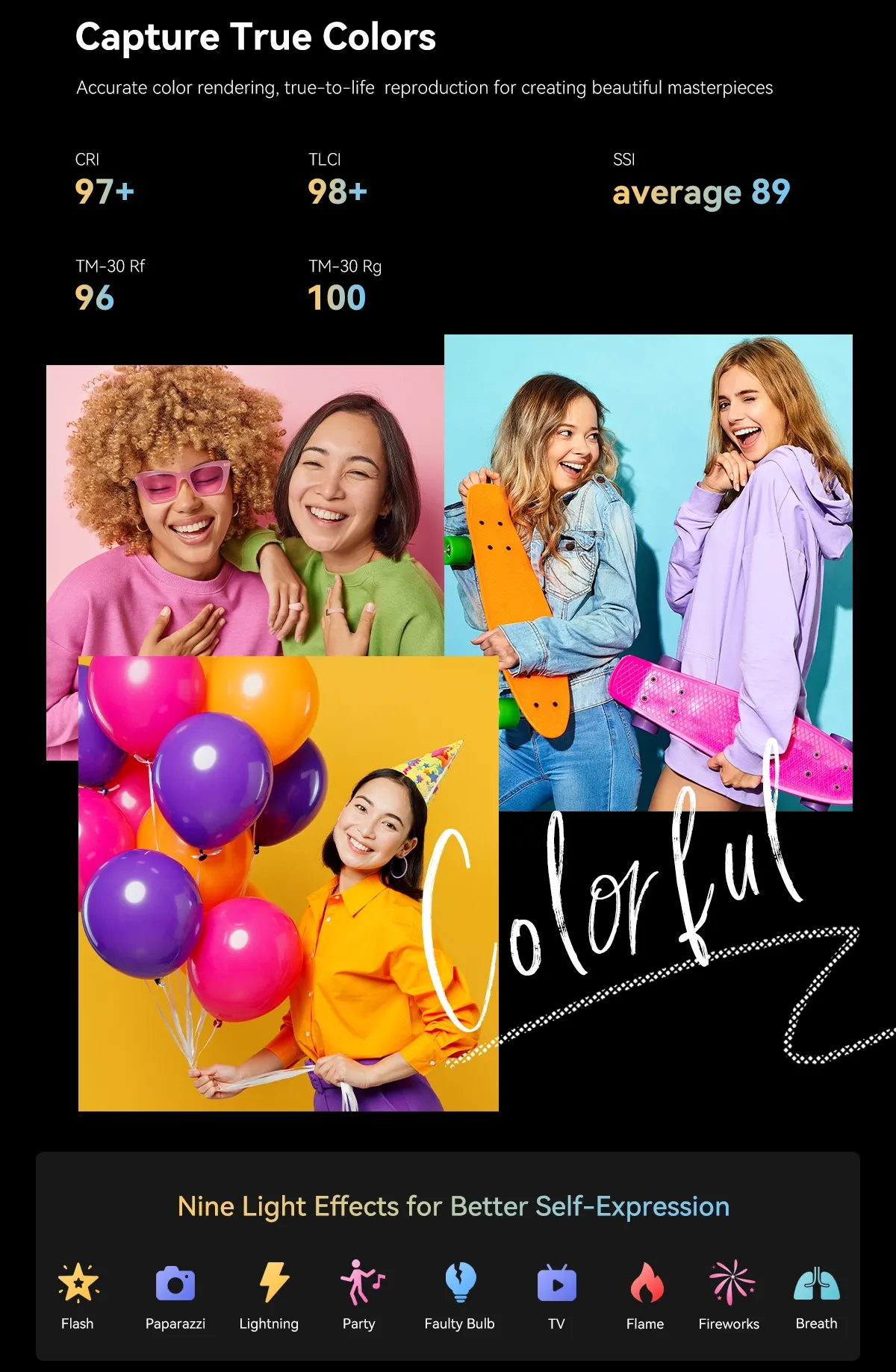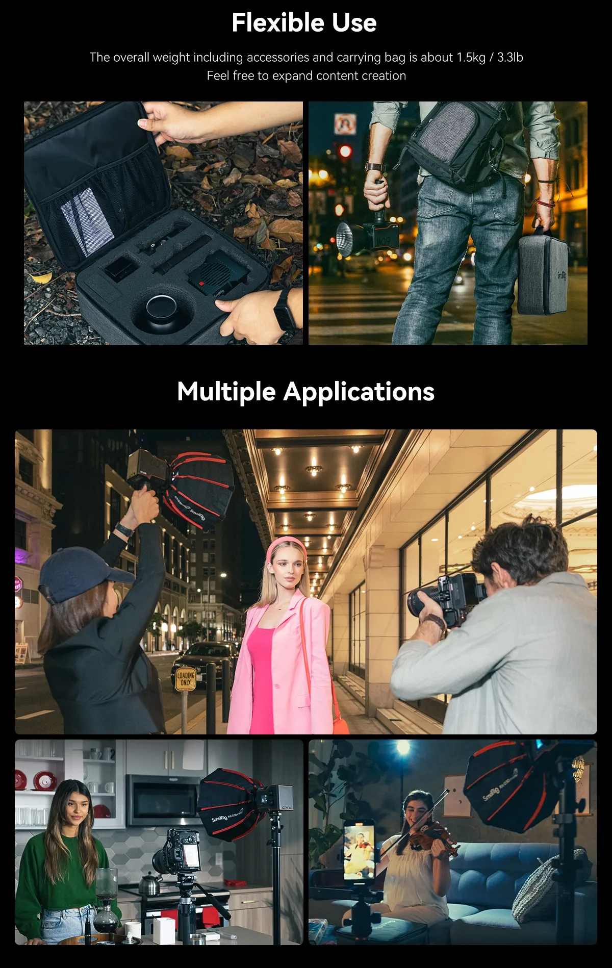 Thân máy nhỏ hơn chỉ nặng 650g, một giàn chiếu sáng cầm tay hoàn hảo.Nguồn sáng có thể điều chỉnh CCT 60W chất lượng cao: dải nhiệt độ màu 2700K-6500K; độ chiếu sáng 2.670 lux (nguồn sáng trần, ở 1m/5600K) và 11.200Lux (với siêu phản xạ, ở 1m/5600K). CRI đạt 97+, TLCI 98+, SSI trung bình đạt 89, TM-30 Rf 96, TM-30 Rg 100, đảm bảo khả năng hiển thị màu chính xác hơn và khả năng khôi phục quang phổ mặt trời tốt hơn.