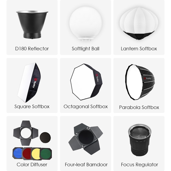 Với ngàm Bowen-S, đèn có thể kết hợp với các phụ kiện sử dụng ngàm Bowen như softbox, bộ tạo hình, choá , snoot