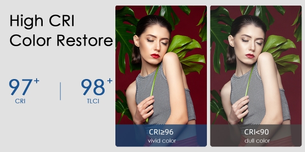 Chỉ số hoàn màu CRI≧96. Độ sáng có thể điều chỉnh từ 10 đến 100%. Độ chính xác tái tạo màu CRI cao, độ bão hòa cao, nhiệt độ màu chính xác. Khôi phục chân thực tông màu da nhân vật, màu sắc sản phẩm và chi tiết kết cấu.