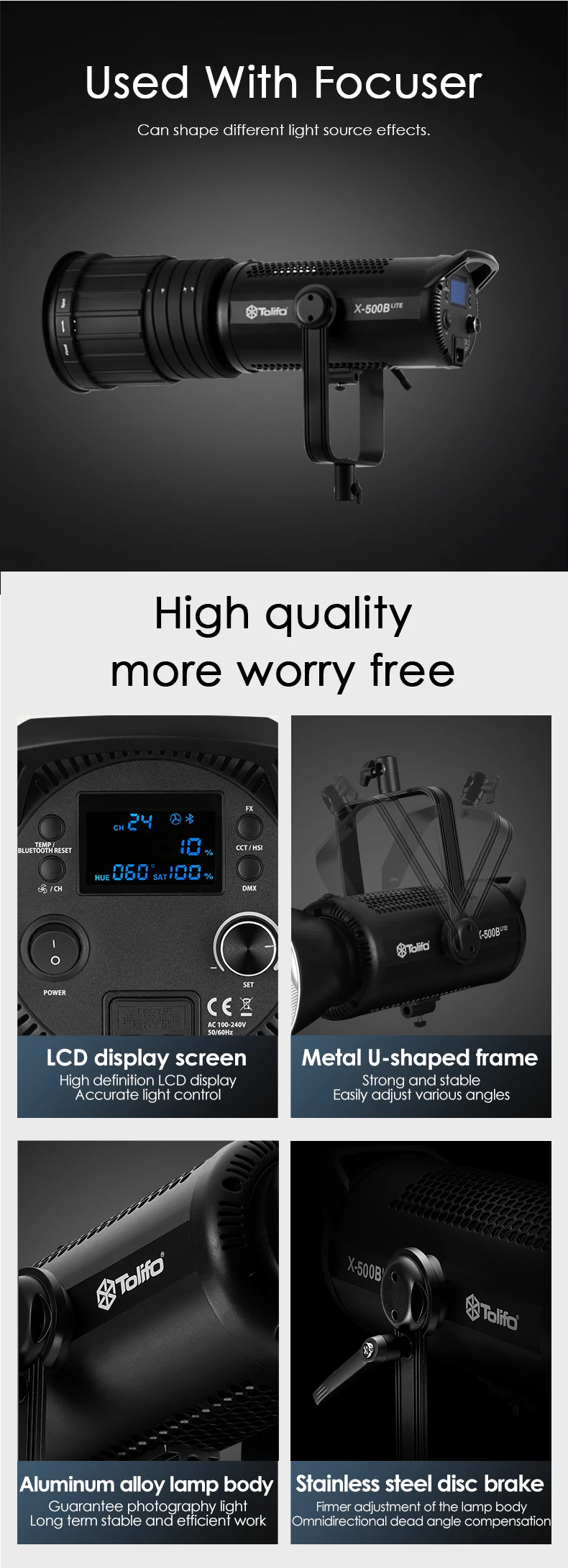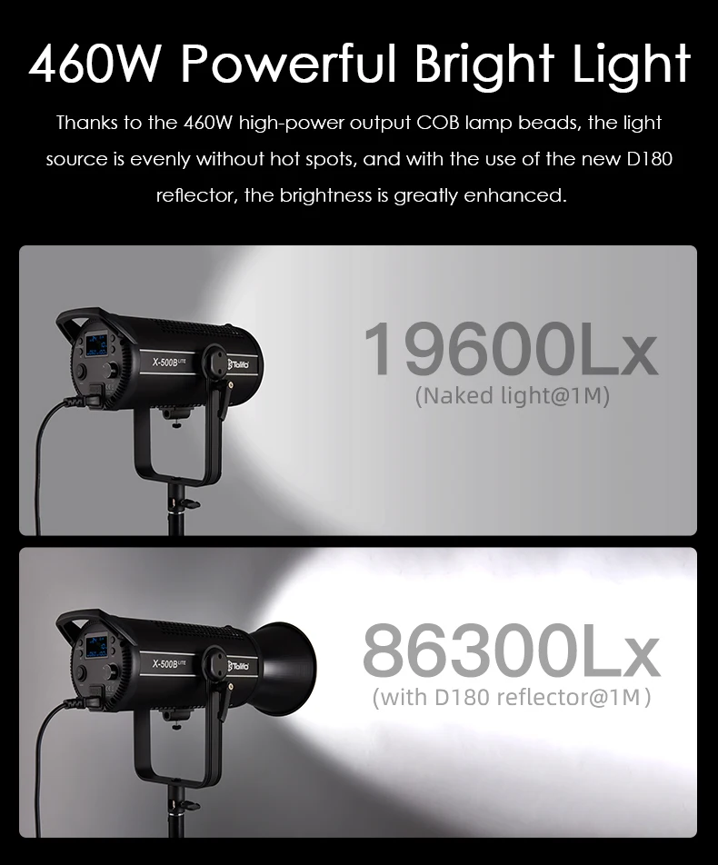 Đèn led Tolifo X-500B Lite cho nguồn sáng mạnh mẽ và mềm mại, có thể giải quyết tốt hơn vấn đề thiếu nguồn sáng cho ánh sáng chuyên nghiệp, để có được hiệu ứng chụp ảnh tự nhiên và chân thực.