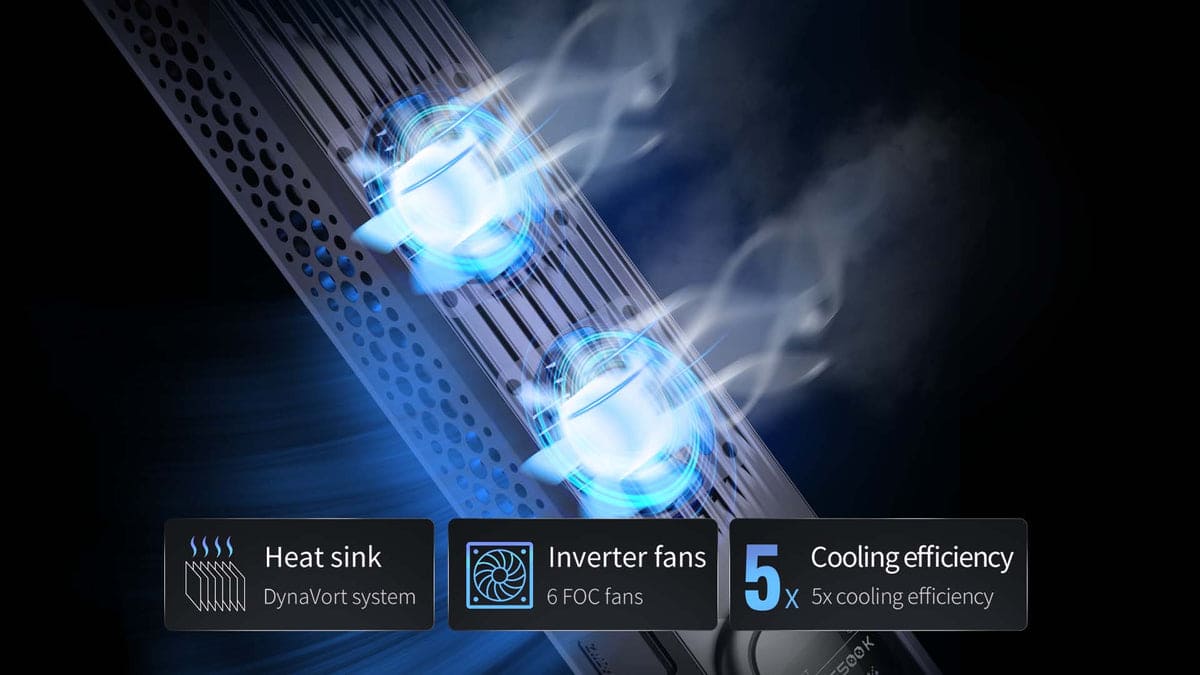 F100 sử dụng Hệ thống làm mát DynaVort™ sáng tạo dựa trên động lực học chất lỏng và thuật toán động. Hệ thống làm mát bao gồm các bộ tản nhiệt mô hình con quay hồi chuyển và 6 quạt FOC để ngăn quá nhiệt, nâng hiệu suất làm mát lên gấp 5 lần bằng cách tăng cường đáng kể lượng khí thải bằng điều khiển thông minh.