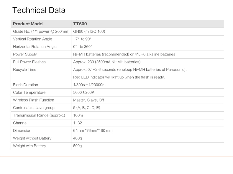 Đèn flash Godox TT600 có tính năng zoom khoảng 24-200mm cũng như màn hình điều khiển rộng 14mm và có điều khiển công suất bằng tay từ 1/1 đến 1/128. Ngoài ra, nó có thể nghiêng từ -7 đến 90 ° và xoay trái và phải 180 °.