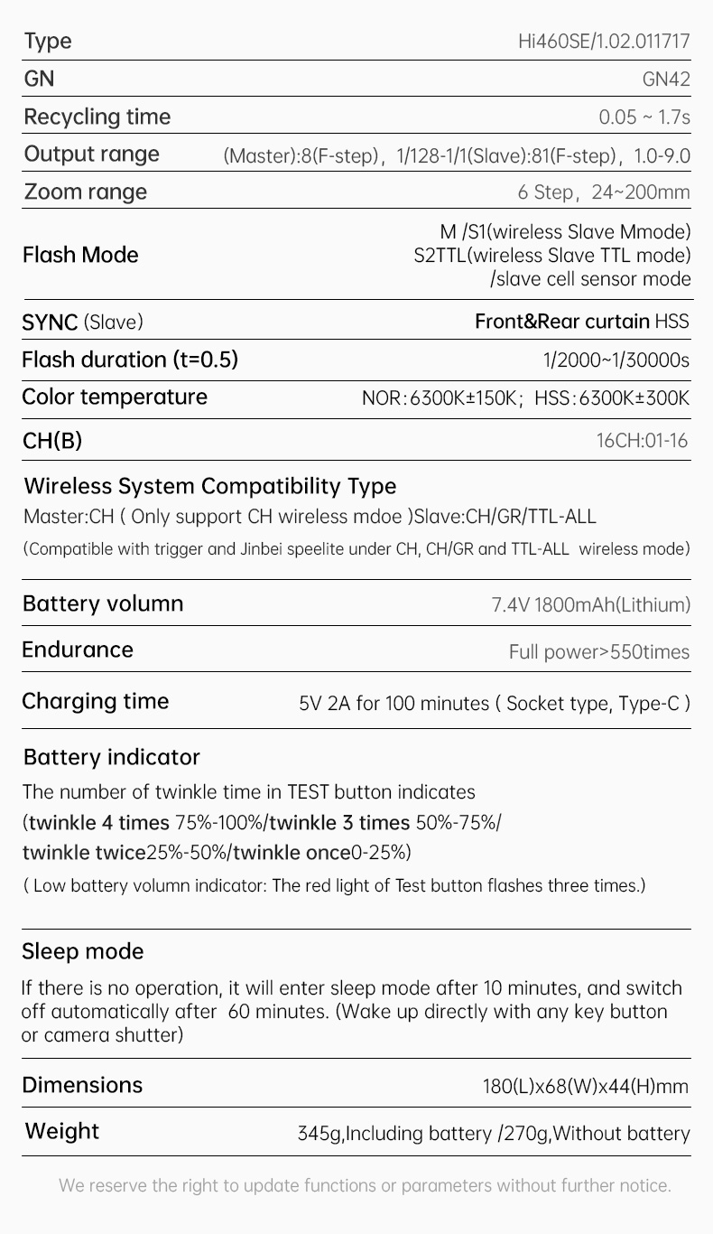 Thiết kế gọn nhẹ, di động: Chỉ nặng 345g (tương đương một cốc cà phê), Jinbei Hi 460SE là người bạn đồng hành lý tưởng cho mọi chuyến đi. Hotshoe đa năng tương thích với nhiều dòng máy ảnh khác nhau, giúp bạn dễ dàng lắp đặt và sử dụng.