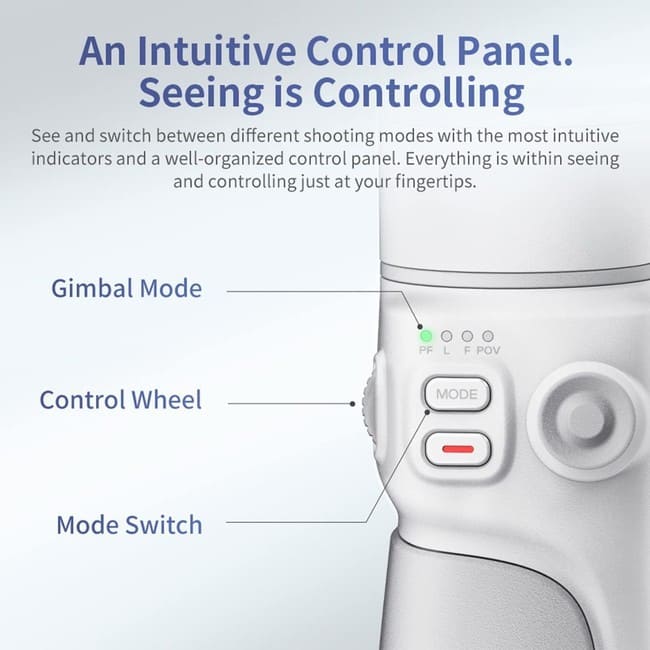 Người dùng có thể dễ dàng sử dụng gimbal Smooth-Q4 chỉ bằng một tay, nhờ hệ thống điều khiển đã được Zhiyun tuỳ chỉnh lại từ joysticks, nút ấn vật lý cho đến bánh xe điều khiển các chức năng như chế độ gimbal và quay video. Ngoài ra, gimbal còn được tích hợp các đèn báo khác nhau giúp hiển thị chế độ hiện tại hoặc mức công suất mà bạn đang sử dụng.