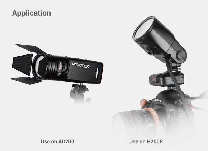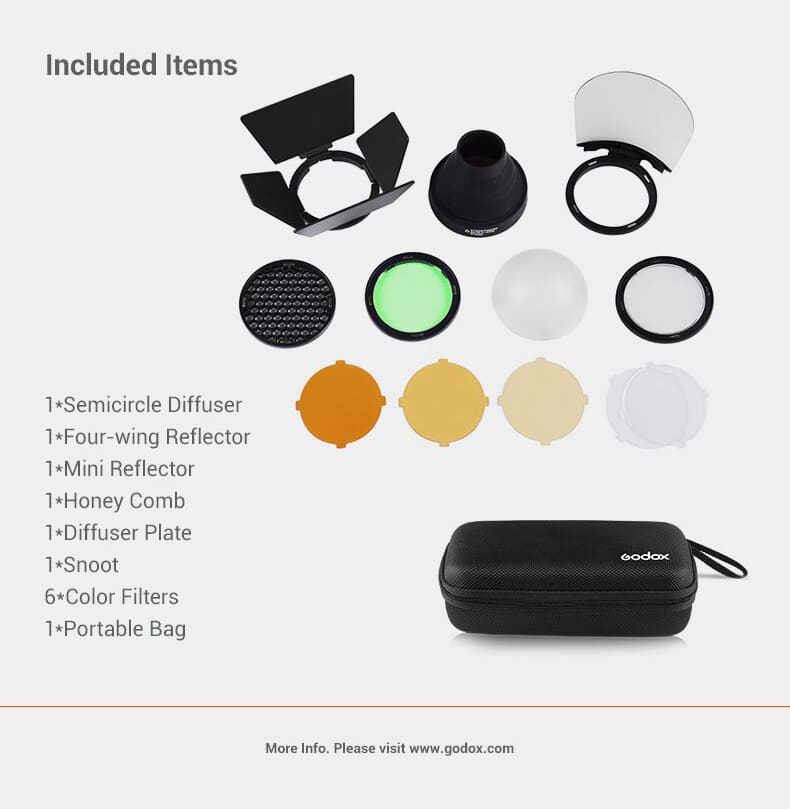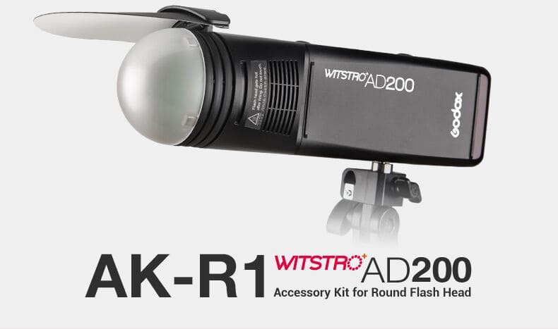 Godox AK-R1 – Một trong những đầu có thể hoán đổi cho nhau của AD200 Pocket Flash là Đầu Flash Tròn. Bộ phụ kiện Godox AK-R1 dành cho Đầu đèn flash tròn này chứa các bộ điều chỉnh được gắn từ tính giúp tối đa hóa khả năng của đầu. Bộ sản phẩm bao gồm một ống ngắm, cửa ra vào bốn chiều và lưới tổ ong để thu hẹp chùm ánh sáng và chiếu sáng có chọn lọc đối tượng của bạn. Ngược lại, một mái vòm gần 180 độ và một tấm thẻ nảy có khung được cung cấp để mở rộng chùm tia. Cuối cùng, một bộ bộ lọc gồm ba bộ lọc CT màu hổ phách và một bộ lọc huỳnh quang màu xanh lá cây cũng được cung cấp.