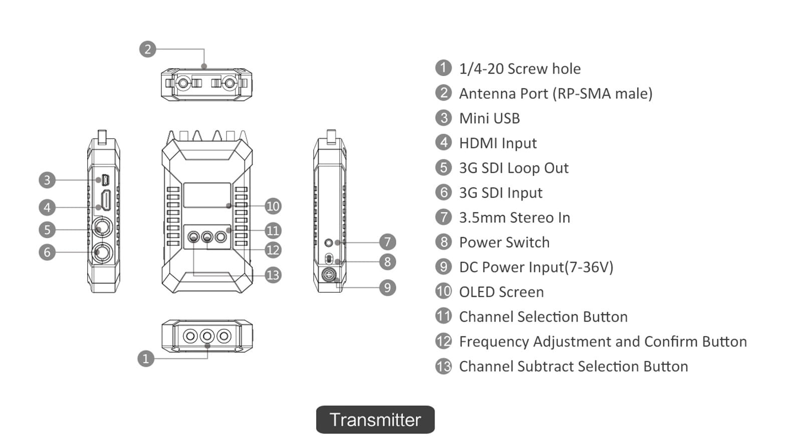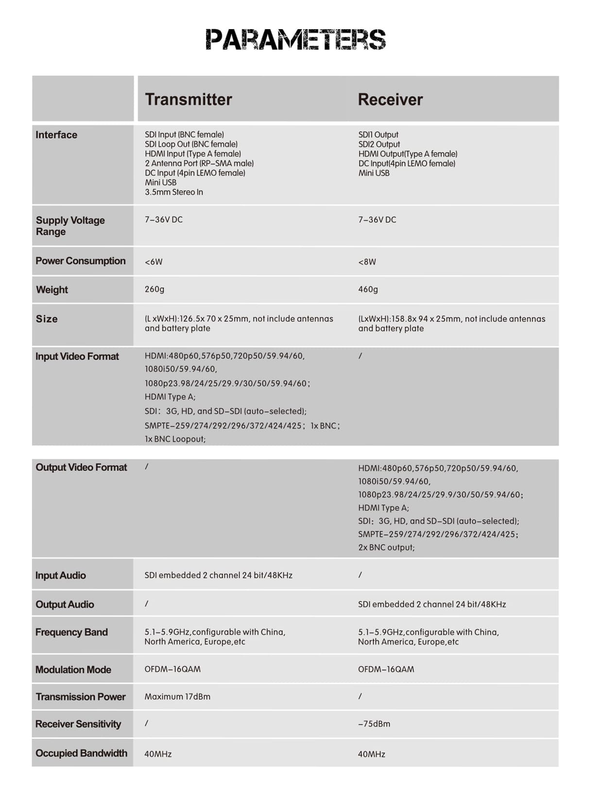 Hệ thống hoạt động trên băng tần 5,1 đến 5,9 GHz và sử dụng mã hóa AES-128 để phân phối trực tiếp an toàn video của bạn. Các tính năng khác bao gồm màn hình OLED trên cả hai thiết bị, mã thời gian và đồng bộ hóa tự động với tính năng ghi camera.