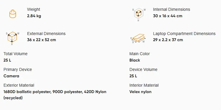Bảo Vệ Kiên Cố Cho Thiết Bị Lớn: Với dung tích 25L, ba lô chứa được 1-2 Pro DSLR (một chiếc gắn ống kính 70-200mm f/2.8), tới 8 ống kính hoặc phụ kiện, và cả DJI Mavic 2 Pro/Zoom. Ngăn CradleFit™ bảo vệ laptop 15 inch tránh va đập từ bên dưới.