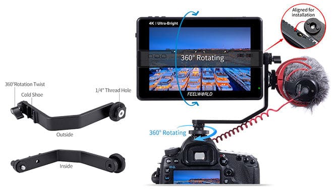 • Màn hình LUT7S PRO có thể xoay 360 độ theo hai cách khác nhau, thuận tiện cho việc xem. (1. Có thể xoay màn hình 360 độ từ trên xuống dưới thông qua điểm gắn bên của thanh nghiêng; 2. Có thể xoay màn hình 360 độ từ trái sang phải thông qua điểm gắn phía dưới của thanh nghiêng).