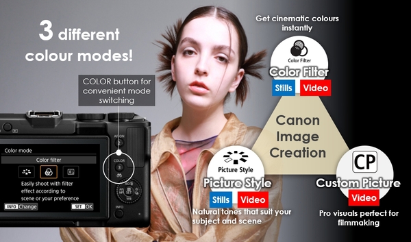 | Cân Bằng Trắng | Auto (Ambience priority / White Priority), Daylight, Shade, Cloudy, Tungsten Light, White Fluorescent Light, Flash*, Custom, Color temperature setting (approx. 2500–10000 K) White balance shift feature available *Flash color temperature information transmission possible (EX / EL Series Speedlite) |