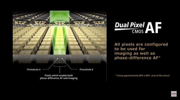 Hệ thống này tích hợp hai photodiodes riêng biệt trong mỗi pixel. Điều này giúp cho chiếc máy ảnh Canon này có thể lấy nét một cách nhanh chóng hơn trong bất kì yếu tố cũng như chủ thể nào. Khi quay video, chế độ Movie Servo AF sẽ giúp cho máy có khả năng quay video một cách mượt mà và tự nhiên nhất.