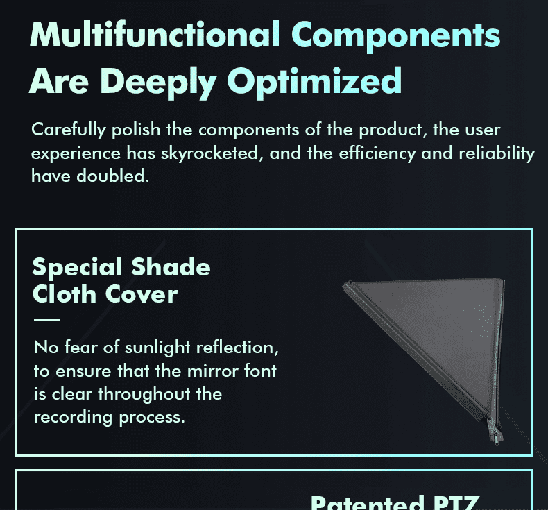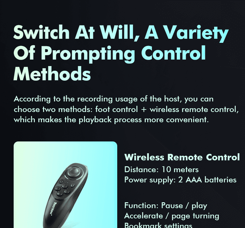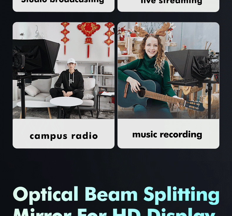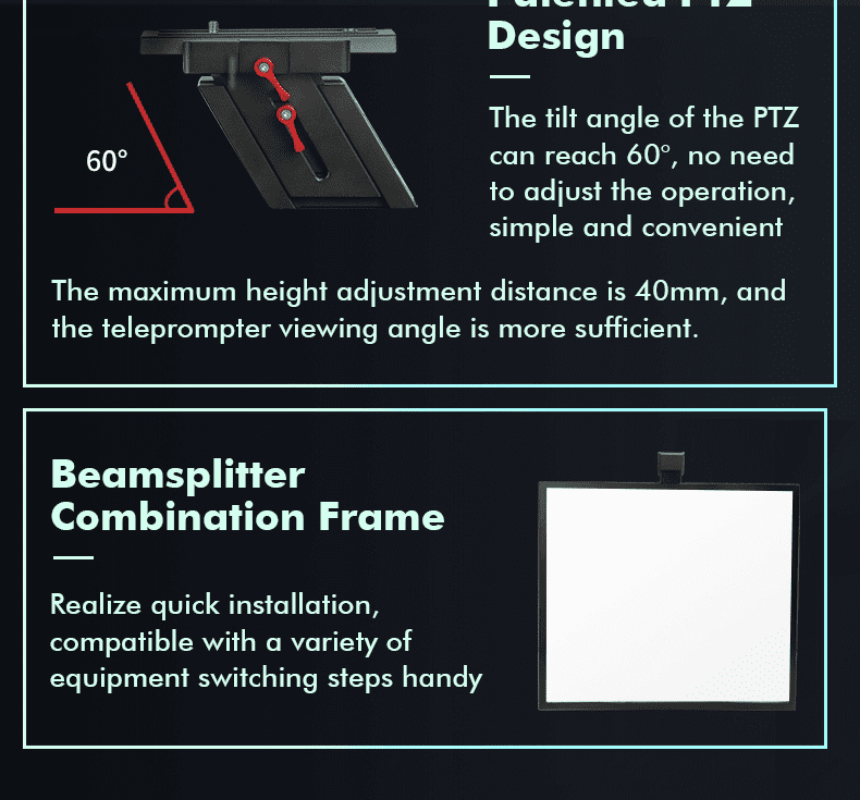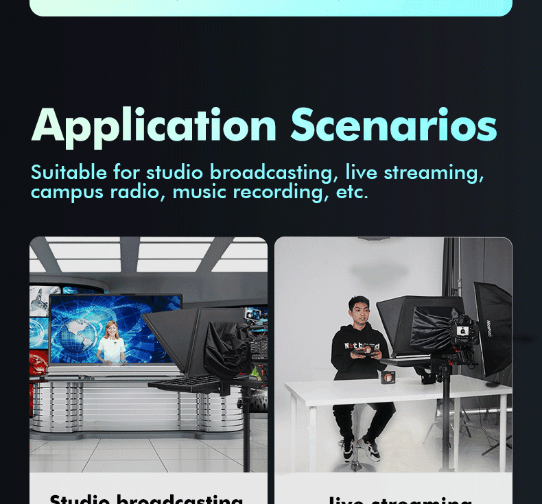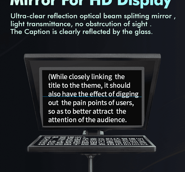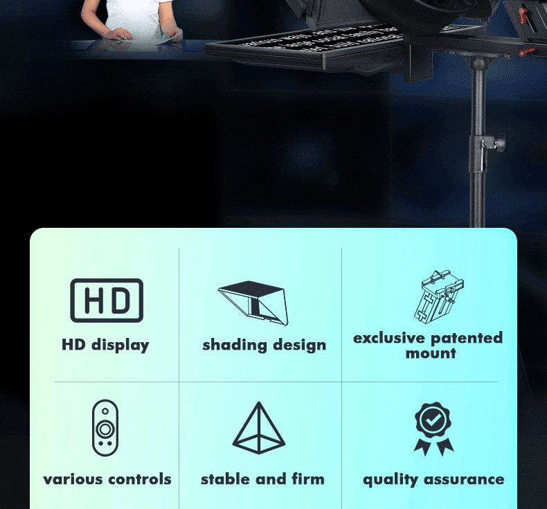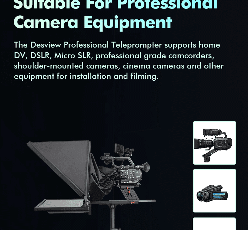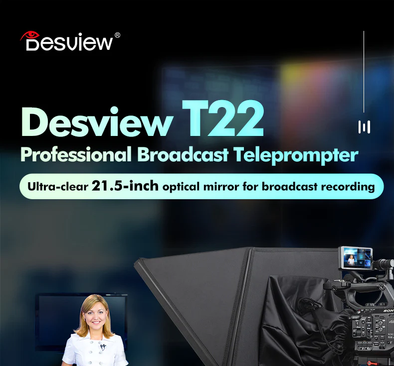 Máy nhắc chữ Teleprompter T22 Desview hỗ trợ máy quay DV gia đình, máy ảnh DSLR, máy quay chuyên nghiệp và các thiết bị khác để lắp đặt và quay phim. Desview T22 thích hợp cho việc phát sóng trong phòng thu, phát trực tiếp, đài phát thanh trong khuôn viên trường, ghi âm nhạc, v.v. Destview T22 có gương tách chùm tia quang học phản xạ cực rõ ràng, truyền sáng, không cản tầm nhìn, phần chú thích được phản chiếu rõ ràng bởi kính. Tùy theo mức độ sử dụng ghi âm của MC, bạn có thể chọn hai phương pháp: điều khiển bằng chân hoặc điều khiển từ xa không dây, giúp quá trình phát lại thuận tiện hơn rất nhiều.