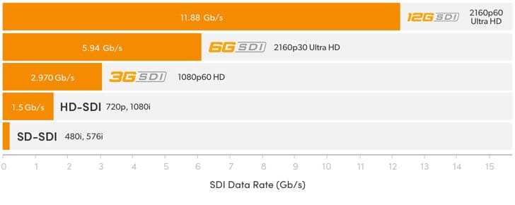 12G‑SDI nhanh hơn gấp 8 lần so với HD-SDI thông thường, đủ nhanh cho video Ultra HD lên đến 60 fps, tất cả thông qua một cáp SDI duy nhất. Kết nối BNC chất lượng cao đa tỉ lệ có thể tự động chuyển đổi và làm việc với các thiết bị 6G-SDI, 3G-SDI và HD-SDI. Điều này có nghĩa là URSA Mini Pro và URSA Mini có thể tương thích với tất cả các thiết bị HD và Ultra HD hiện có của bạn.